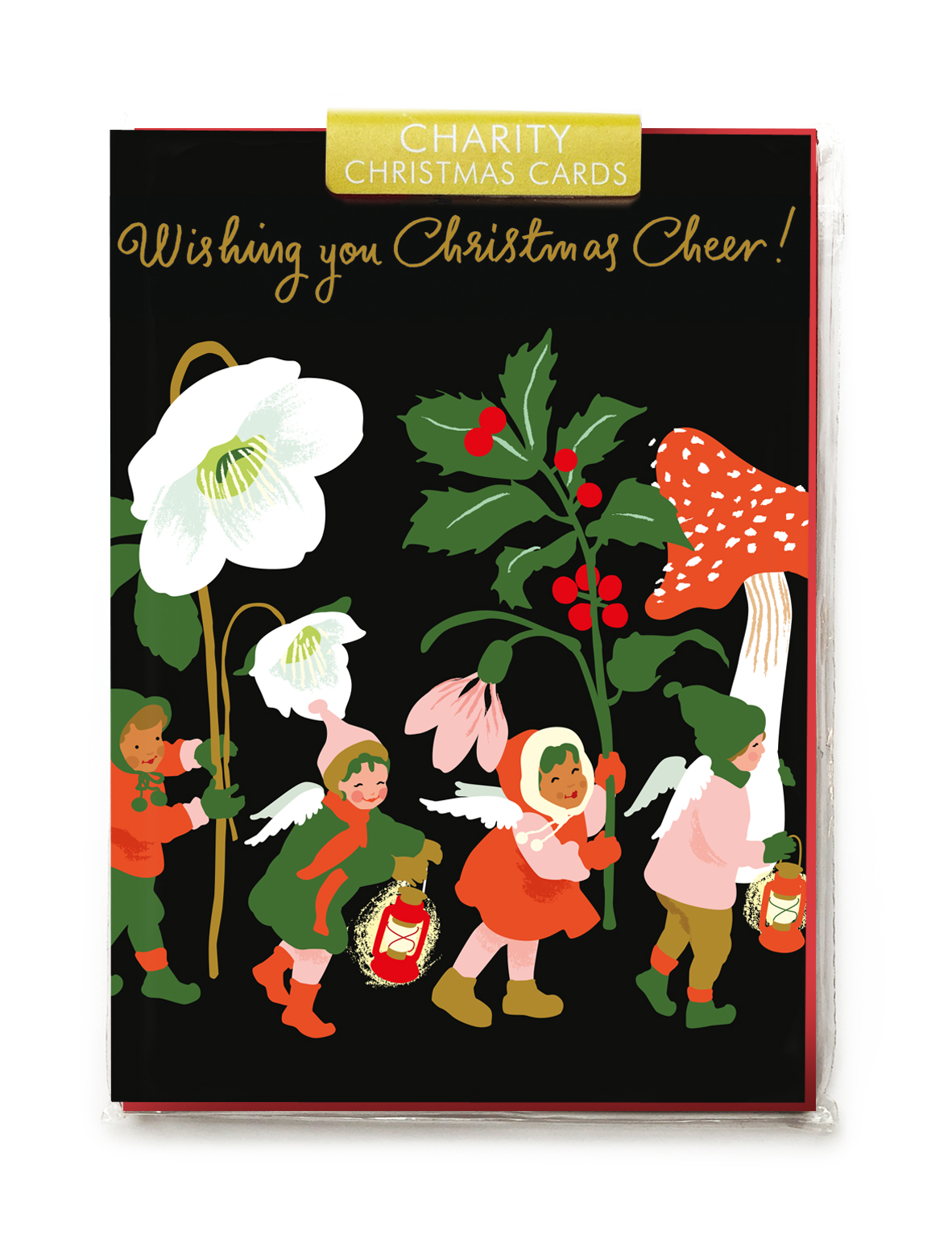 A charity pack of 5 cards and 5 envelopes. Christmas angels and lanterns, ‘Wishing you Christmas cheer’ gold foil message. Blank inside and supplied with bright red envelopes. Noi Publishing will donate 25p from the sale of each pack of cards, to Caring in Bristol, who work with people experiencing or at risk of homelessness. Registered Charity No.1151645.