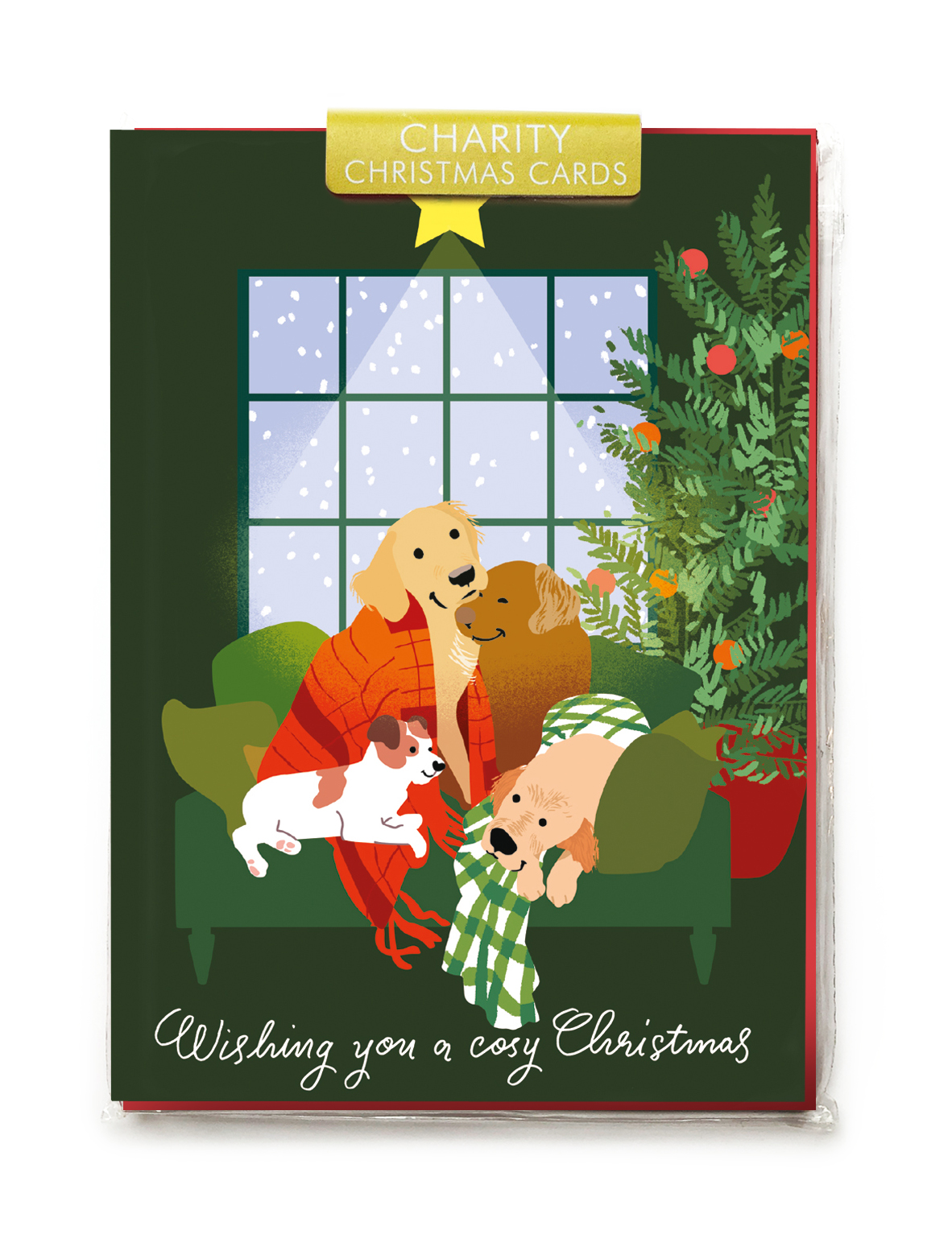 A charity pack of 5 cards and 5 envelopes. Cosy dogs, ‘Wishing you a cosy Christmas’ message. Blank inside and supplied with bright red envelopes. Noi Publishing will donate 25p from the sale of each pack of cards, to Caring in Bristol, who work with people experiencing or at risk of homelessness. Registered Charity No.1151645.