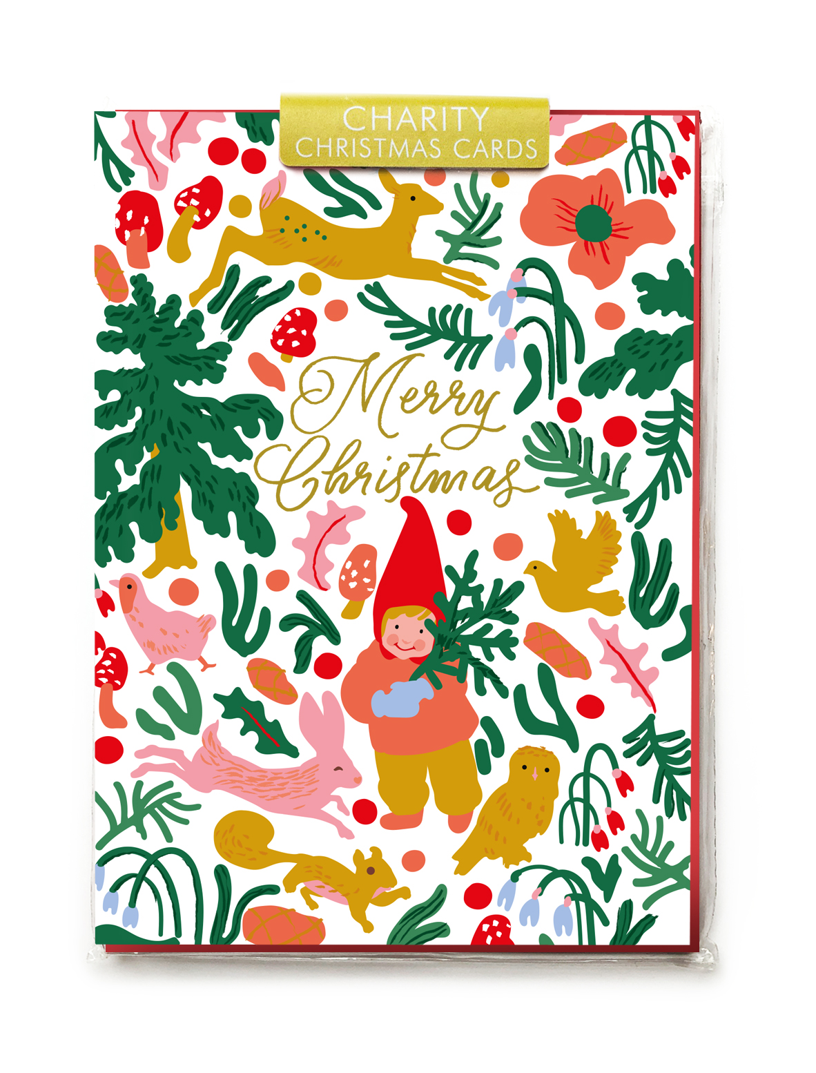 A charity pack of 5 cards and 5 envelopes. Christmas forest, ‘Merry Christmas’ gold foil message. Blank inside and supplied with bright red envelopes. Noi Publishing will donate 25p from the sale of each pack of cards, to Caring in Bristol, who work with people experiencing or at risk of homelessness. Registered Charity No.1151645.