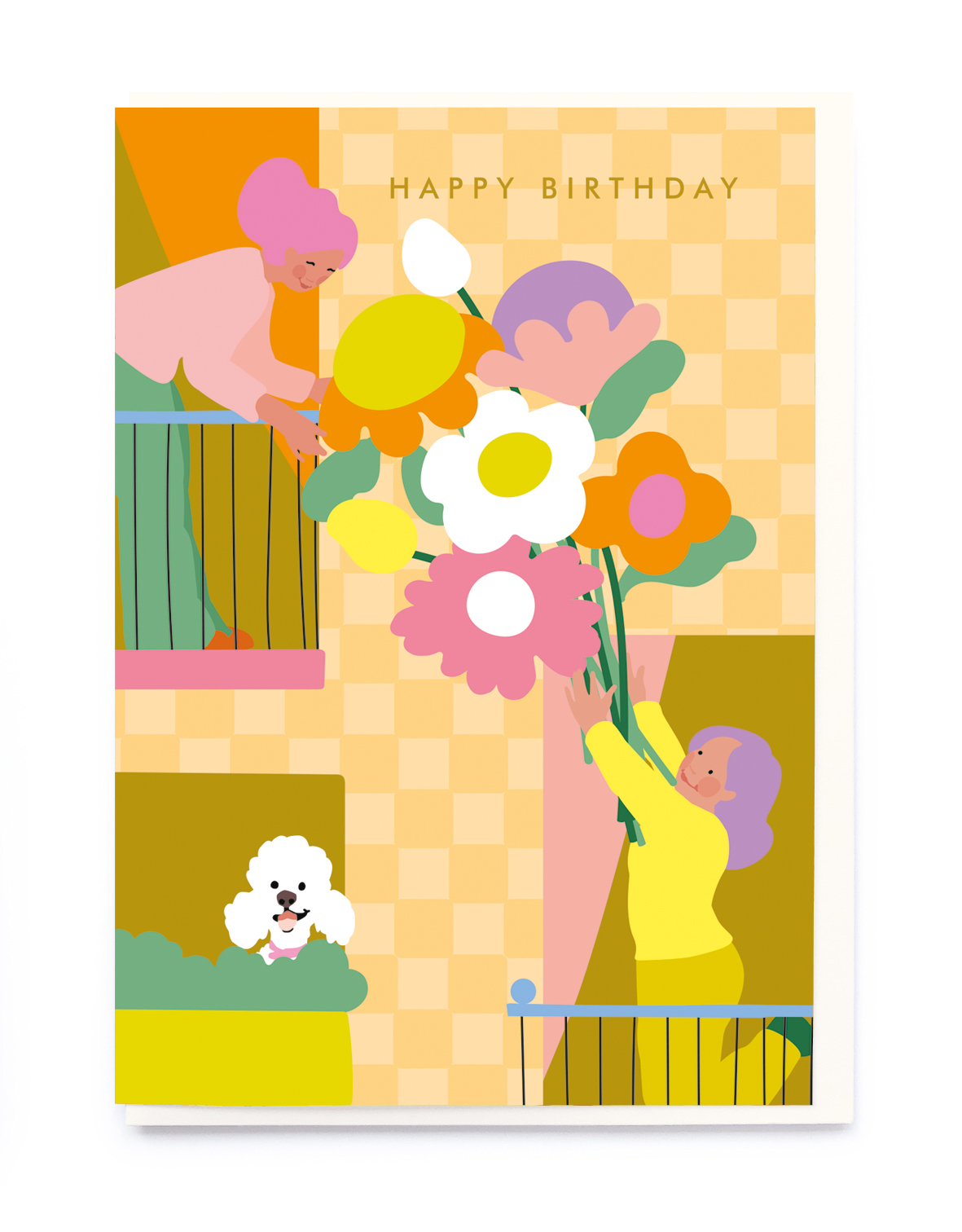 Window flowers ‘happy birthday’ gold foil message. Blank inside and supplied with an off white envelope.